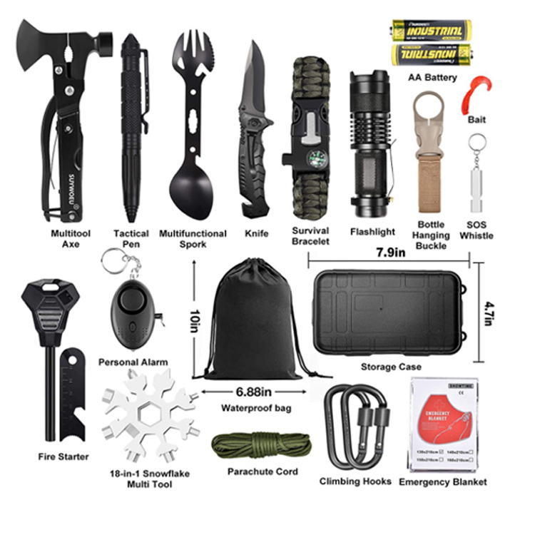 ·✅【Équipement et équipement de survie nécessaires】 Tout est de bonne qualité. Vous obtiendrez : hachette 14 en 1, outil multifonction flocon de neige 18 en 1, stylo tactique, couteau de survie, fourchette à cuillère multi-usage, bracelet de survie, lampe de poche, sifflet, bracelet de survie, pince à bouteille d'eau, couverture d'urgence, cordon de parachute, mousqueton 2 pièces. , soufflet de poche, grattoir en silex, 2 bâtons lumineux, accessoires de pêche, 2 piles AA et boîtier étanche.