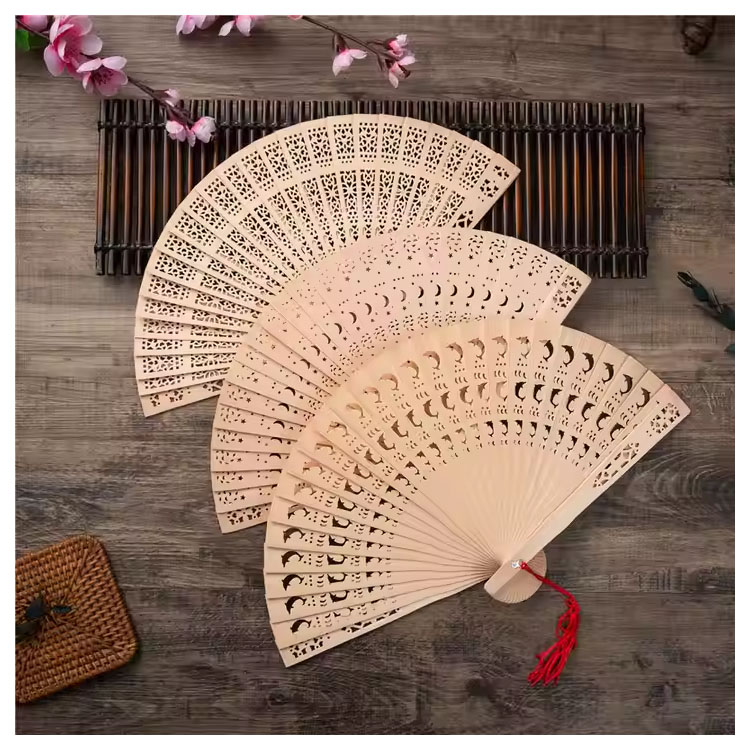 Fabriqué de manière experte à partir de bambou naturel, chaque éventail présente des motifs découpés complexes et des finitions lisses qui évoquent l'élégance traditionnelle. Un mélange parfait de fonctionnalité et d'esthétique, idéal pour les soirées à thème vintage, les mariages en plein air ou les événements culturels.