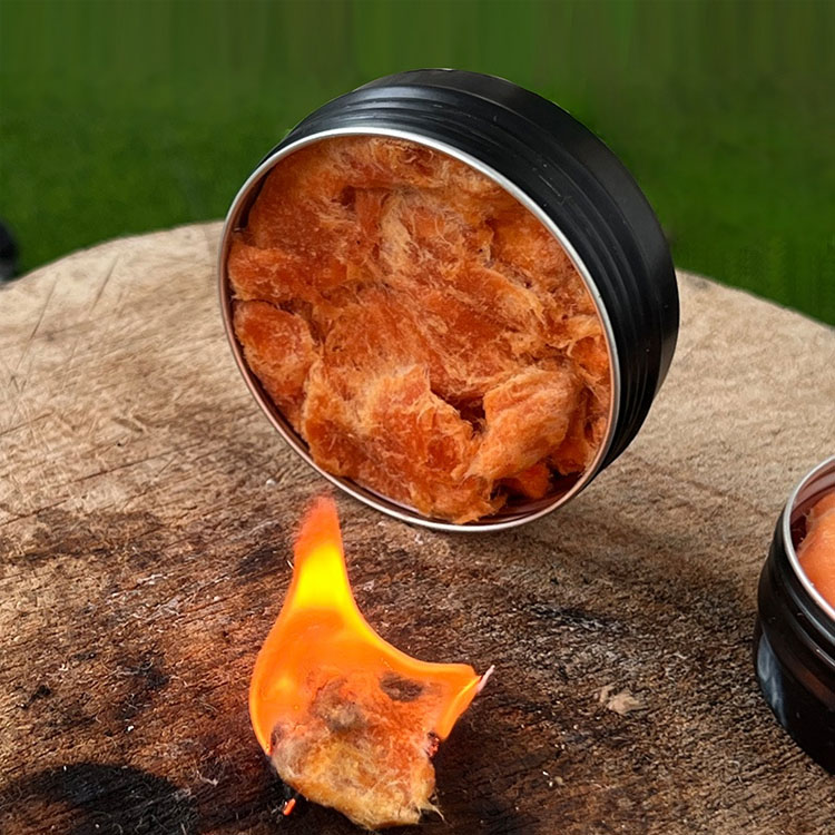 Chaque brin de coton est infusé de cire à haute température et d'argile résistante au feu, créant une flamme soutenue durant 3 à 5 minutes - beaucoup plus longtemps que l'amadou ordinaire - vous laissant suffisamment de temps pour établir votre feu de camp.