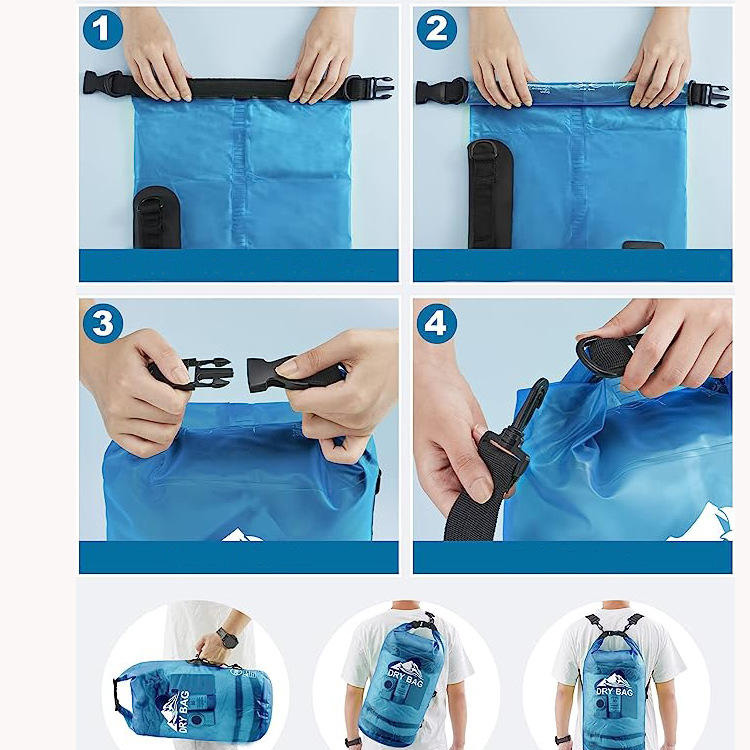 Roll Top Portable Facile à utiliser Transportant un sac sec transparent. Votre solution étanche innovante pour les aventures en plein air. Ce nouveau sac sec design dispose d'une fermeture transparente à enroulement pour une identification facile. Avec plusieurs options de taille et une conception de transport portable, il est parfait pour la randonnée et divers environnements humides.